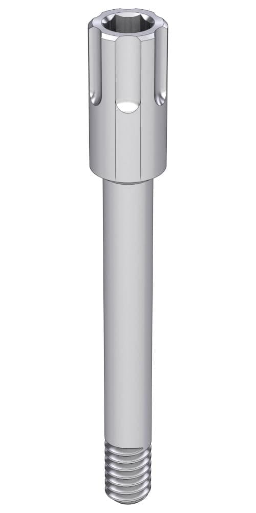 It has a long cylindrical head that leans onto the top of the impression post. It can be used to fix the open tray impression post by hand or with a wrench.